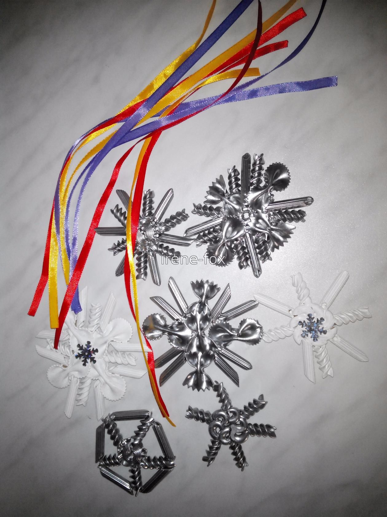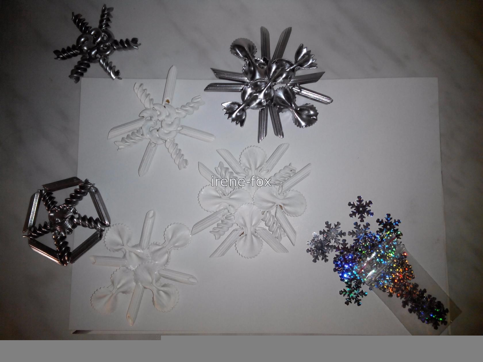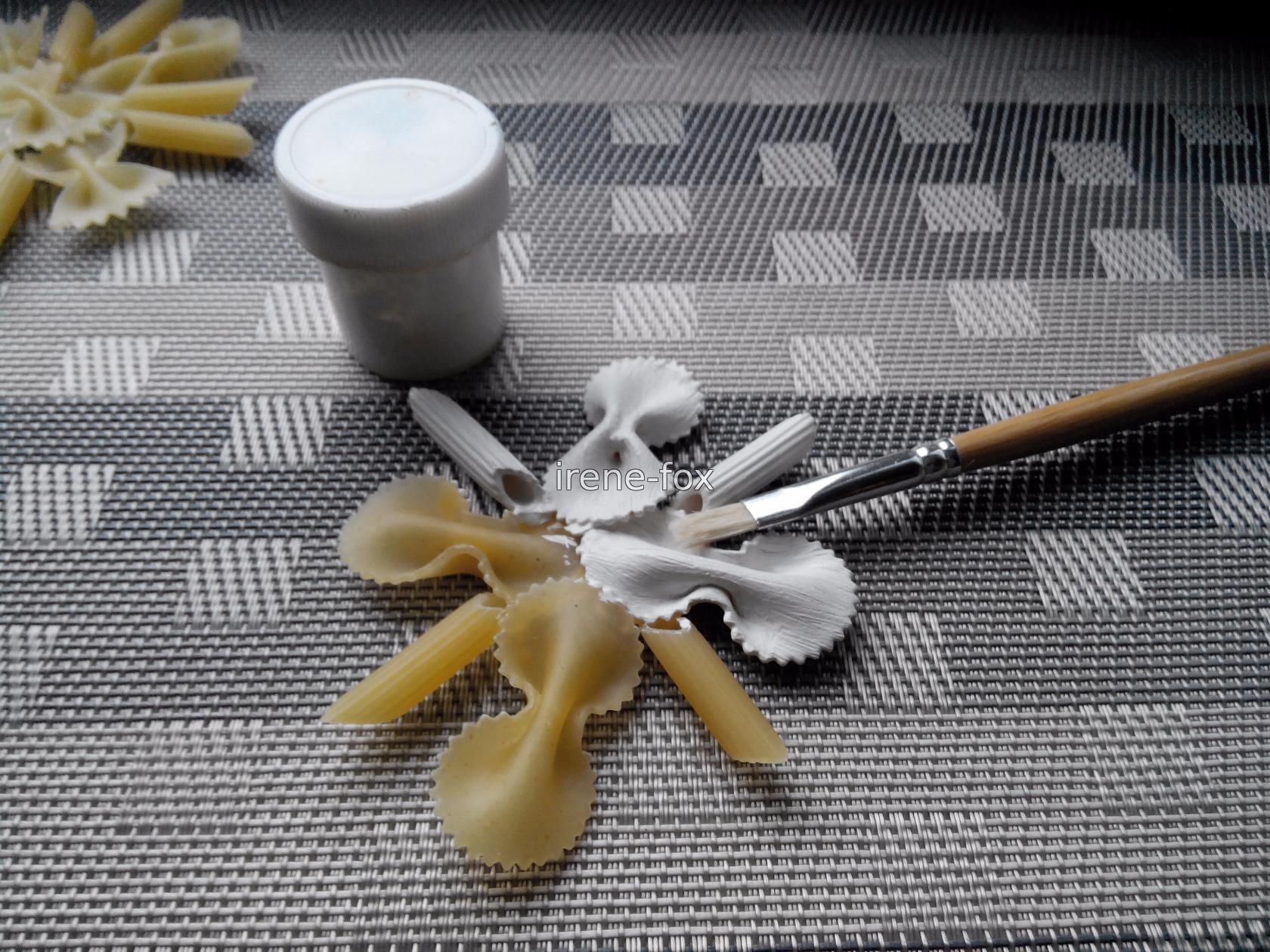 Вам понадобятся макароны различной формы, не обязательно скупать все, что есть на полках магазинов, будет достаточно 3-5 видов. Я предлагаю использовать: - бабочки двух видов; - спиральки; - колеса; - рожки. Берем досточку (чтобы не замазать стол, когда будем склеивать макароны) и начинаем выкладывать различные фигуры. Это довольно увлекательное занятие сродни собиранию конструктора – есть определенный стандартный набор элементов, из которых можно сделать все что угодно. Для детей это будет не только интересно, но и полезно. Подобные занятия помогают развивать фантазию, пространственное мышление и мелкую моторику. Экспериментируйте, пробуйте различные комбинации, в итоге у вас обязательно получится создать уникальная и неповторимая снежинка из макарон своими руками. Склеивать все элементы будем супер клеем, можно так же воспользоваться силиконовым пистолетом или любым полимерным клеем. Нам важно чтобы он быстро схватывался и не пах. Когда изделие полностью высохло, красим его гуашью (или Покупать целый набор не обязательно, маленькие баночки продаются и по отдельности. Выбирая цвет, ориентируйтесь не только на собственный вкус, но и на интерьер который будете украшать. Беспроигрышный вариант – белый, он и к новогодней тематике подходит и сочетается со всем.