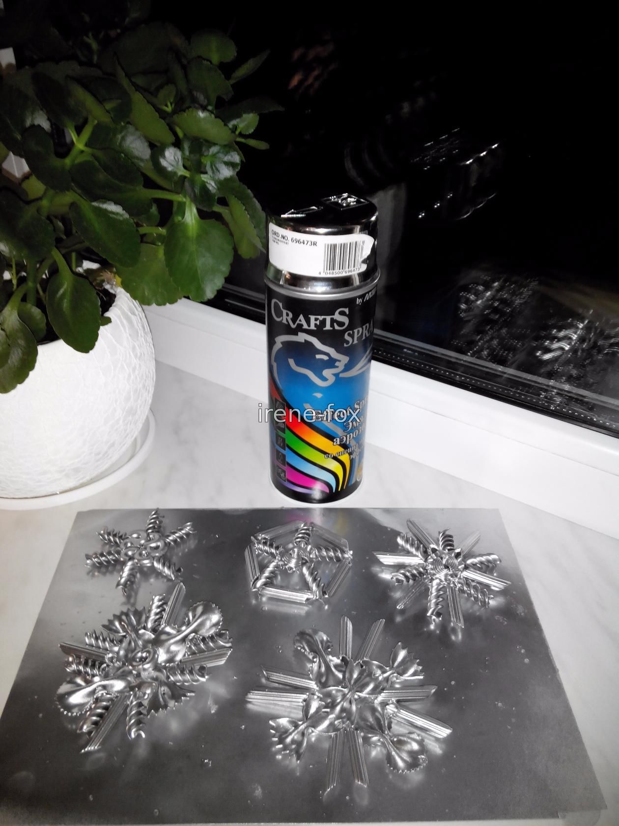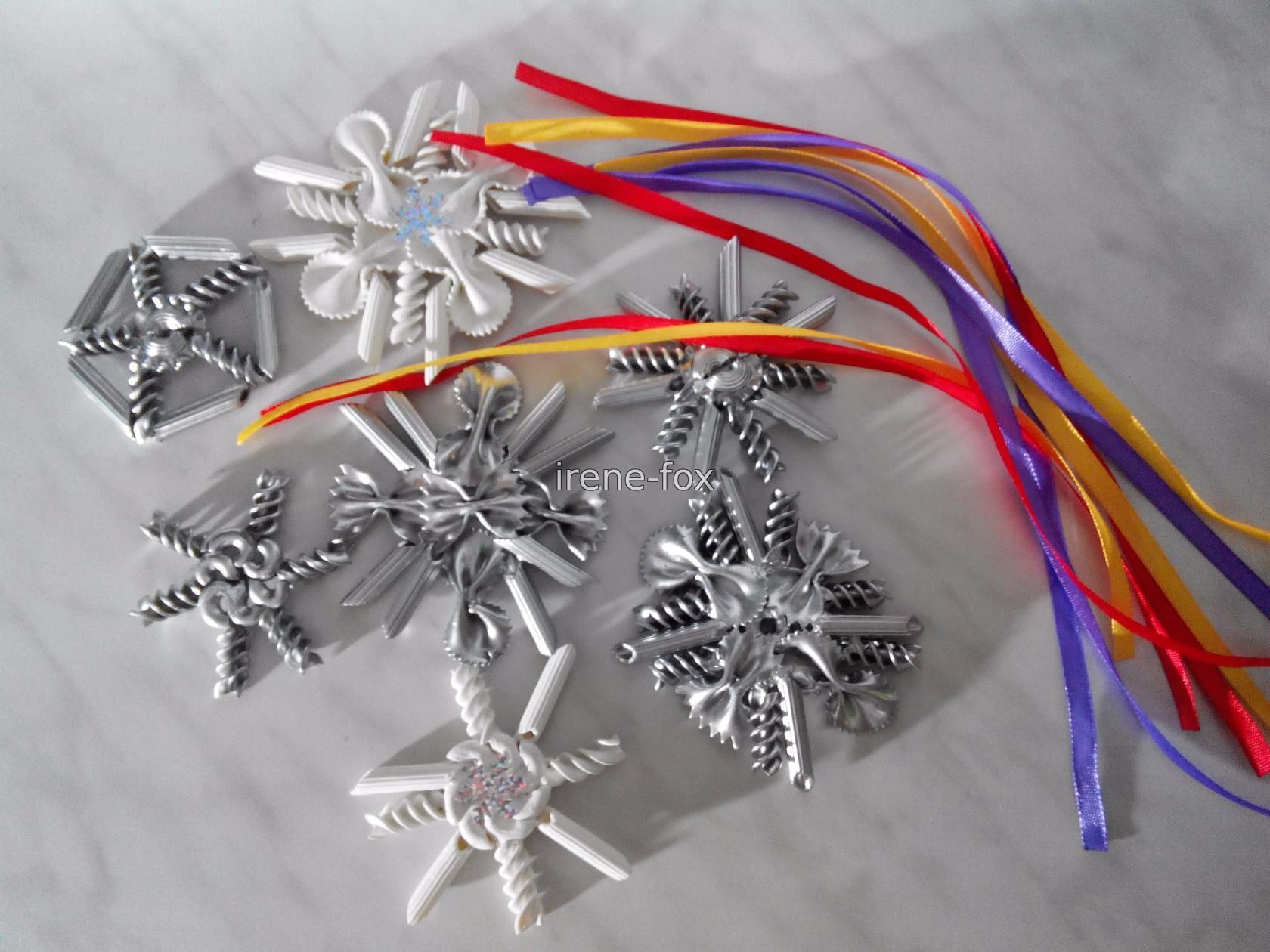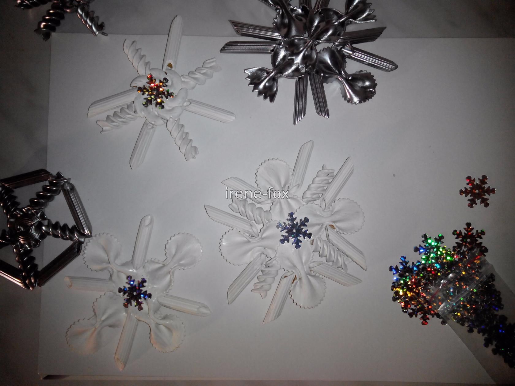 Вам понадобятся макароны различной формы, не обязательно скупать все, что есть на полках магазинов, будет достаточно 3-5 видов. Я предлагаю использовать: - бабочки двух видов; - спиральки; - колеса; - рожки. Берем досточку (чтобы не замазать стол, когда будем склеивать макароны) и начинаем выкладывать различные фигуры. Это довольно увлекательное занятие сродни собиранию конструктора – есть определенный стандартный набор элементов, из которых можно сделать все что угодно. Для детей это будет не только интересно, но и полезно. Подобные занятия помогают развивать фантазию, пространственное мышление и мелкую моторику. Экспериментируйте, пробуйте различные комбинации, в итоге у вас обязательно получится создать уникальная и неповторимая снежинка из макарон своими руками. Склеивать все элементы будем супер клеем, можно так же воспользоваться силиконовым пистолетом или любым полимерным клеем. Нам важно чтобы он быстро схватывался и не пах. Когда изделие полностью высохло, красим его гуашью (или Покупать целый набор не обязательно, маленькие баночки продаются и по отдельности. Выбирая цвет, ориентируйтесь не только на собственный вкус, но и на интерьер который будете украшать. Беспроигрышный вариант – белый, он и к новогодней тематике подходит и сочетается со всем.